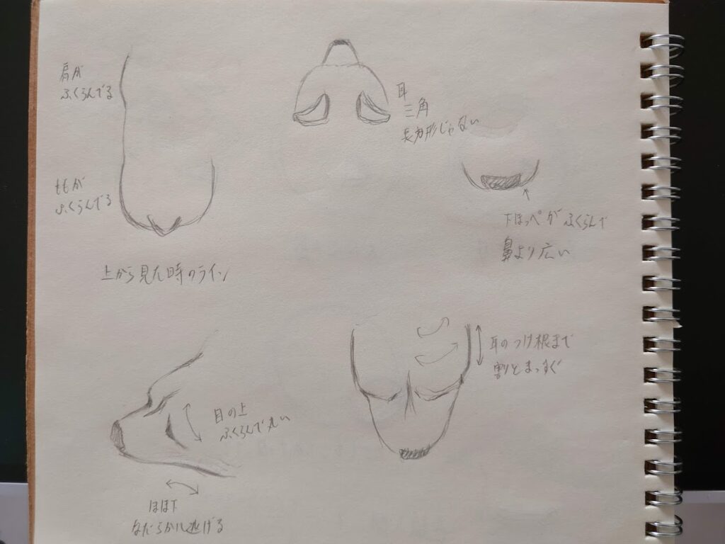 顔の左右に走ってるメッシがほぼ一直線になっているが、わんこを描いたノートのとおりにするなら、下から右上に楕円じゃないといけない。