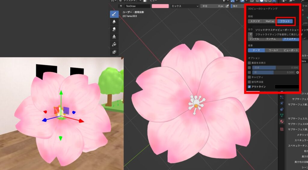 Blenderのマテリアルプレビューで確認できる花びらのシワっとした凹凸感が、どちらも消え失せている。