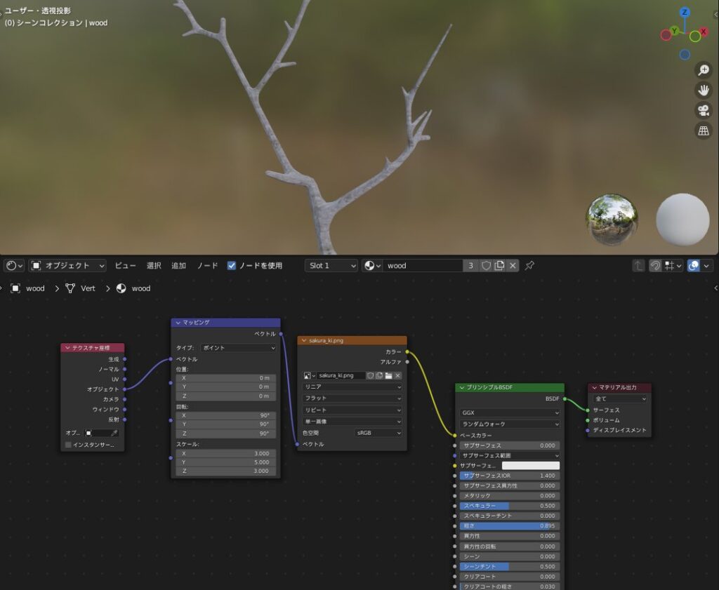 昨日の画像テクスチャは、ただマテリアルに適用しただけだったんで、座標軸を設定してやれば伸びないんじゃね?!と考えて、ノード設定をやってみた。
